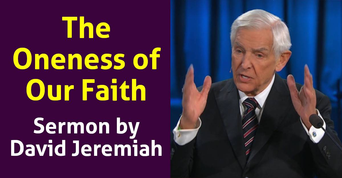 Watch David Jeremiah Sermon: The Oneness of Our Faith. Unity. The apostle Paul pleaded for it. Christ Himself prayed for it. But Christians seem to be further from unity than ever. In this message, Dr. David Jeremiah explores a passage of Scripture that stresses the importance of unity by defining its access points and teaching us how to practice it with others. Covers Ephesians 4:1-6.