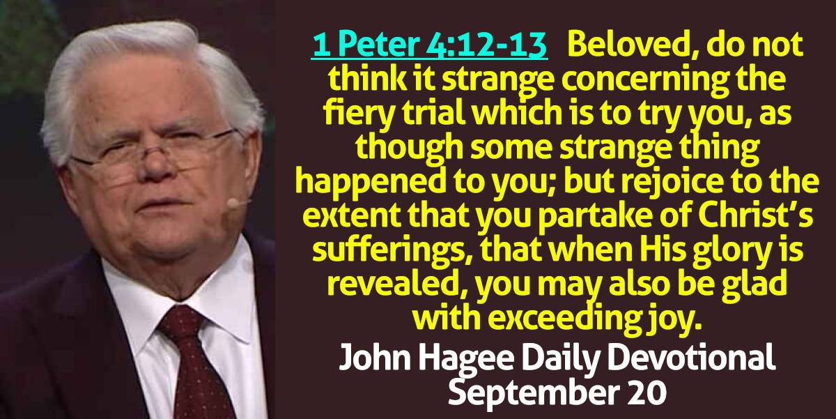 John Hagee (September-20-2025) Daily Devotional: 1 Peter 4:12-13 - Beloved, do not think it strange concerning the fiery trial which is to try you, as though some strange thing happened to you; but rejoice to the extent that you partake of Christ’s sufferings, that when His glory is revealed, you may also be glad with exceeding joy.
