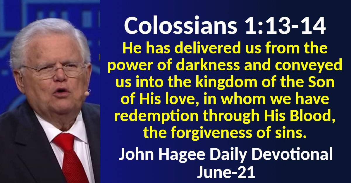 John Hagee (June-21-2025) Daily Devotional: Colossians 1:13-14 - He has delivered us from the power of darkness and conveyed us into the kingdom of the Son of His love, in whom we have redemption through His Blood, the forgiveness of sins.