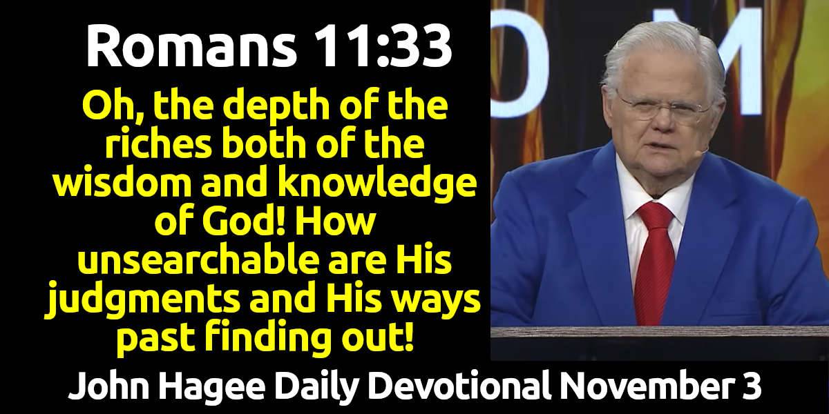 John Hagee (November-03-2025) Daily Devotional: Romans 11:33 - Oh, the depth of the riches both of the wisdom and knowledge of God! How unsearchable are His judgments and His ways past finding out!