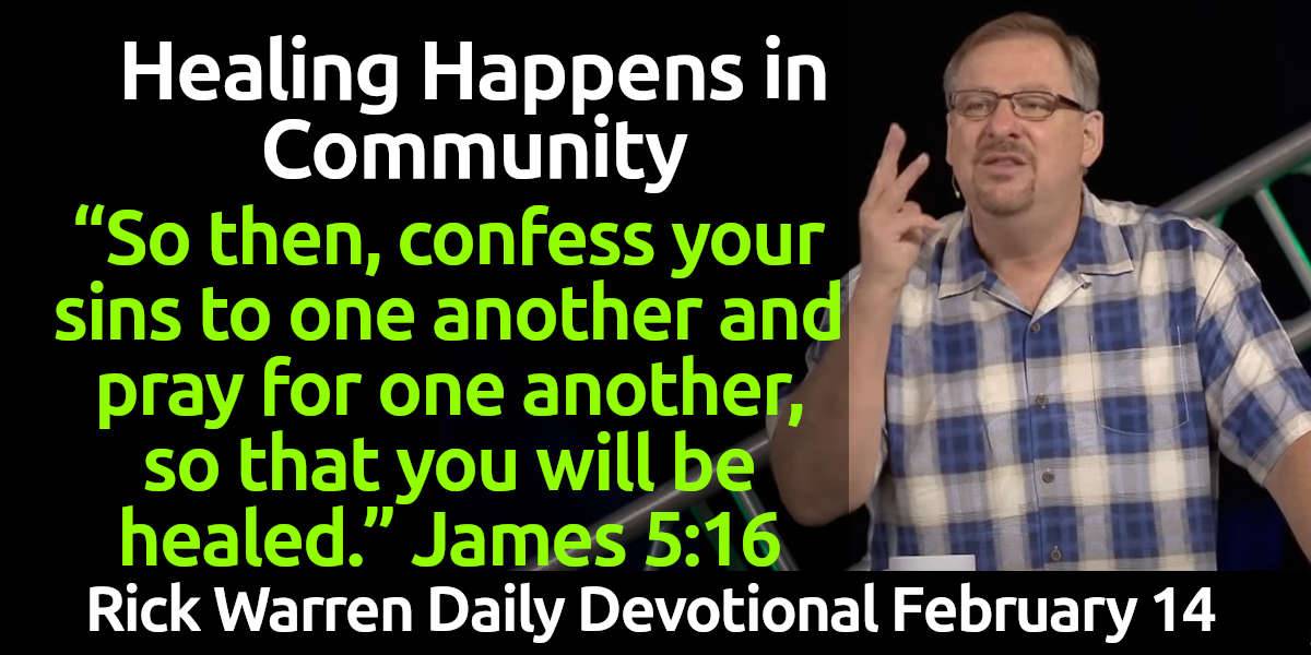 Healing Happens in Community - Rick Warren Daily Devotional (February 14, 2025). “So then, confess your sins to one another and pray for one another, so that you will be healed.” James 5:16 (GNT)