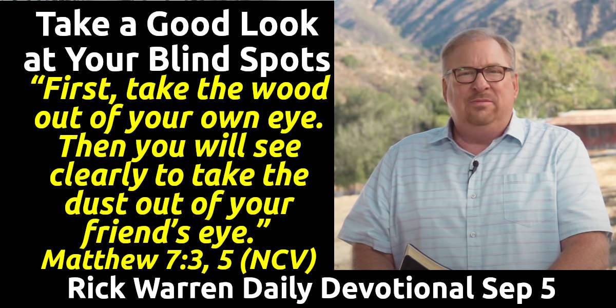 Take a Good Look at Your Blind Spots - Rick Warren Daily Devotional (September 5, 2025). “Why do you notice the little piece of dust in your friend’s eye, but you don’t notice the big piece of wood in your own eye? . . . First, take the wood out of your own eye. Then you will see clearly to take the dust out of your friend’s eye.” Matthew 7:3, 5 (NCV)