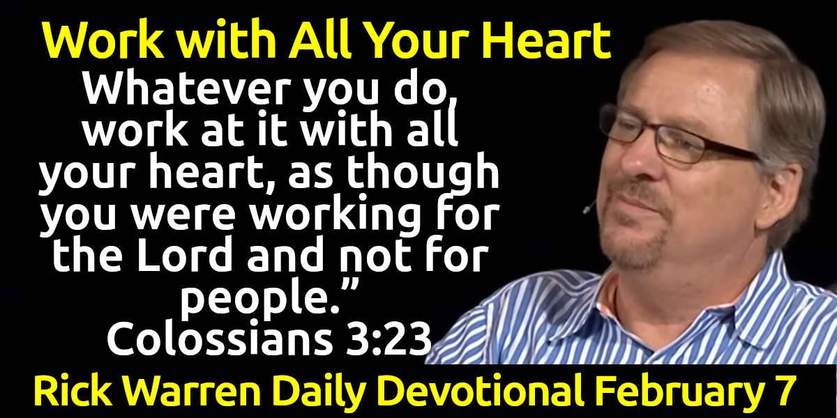 Work with All Your Heart - Rick Warren Daily Devotional (February 7, 2025). “Whatever you do, work at it with all your heart, as though you were working for the Lord and not for people.” Colossians 3:23 (GNT)