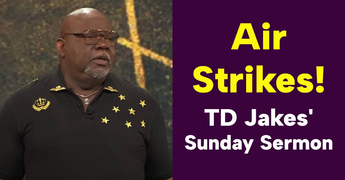 Air Strikes! - TD Jakes. Scripture: Exodus 17:8-15 (KJV) You don't just win because you're a warrior; you win because you have an intercessor. You can only fight alone so long before you need help. When the battle is long and weariness comes fast, the Spirit gives you a vantage point. The more you pray, the higher you get. With God, you have the leverage to drop bombs on the enemy! It's a multilevel attack: You fight it on the ground, while God fights it from the hill. Is your war strategy sustainable? Make it an air strike — the aftermath is guaranteed victory!